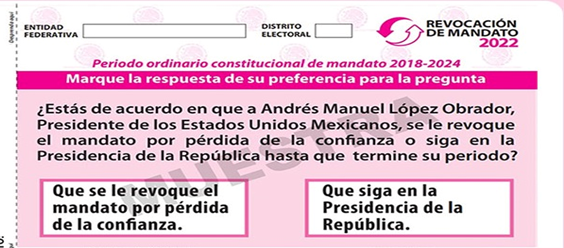 El desarrollo para construir la votación de la revocación de mandato, pasó por la mesa del Tribunal Electoral para calificar el diseño de la pregunta en la consulta, porque en un momento de la construcción, la revocación pasó a ser una votación para refrendar la continuación de AMLO en el gobierno y no la propia revocación, que por definición, revocar un mandato es la conclusión anticipada del ejecutivo federal por pérdida de confianza, pero las fuerzas políticas de AMLO promueven la votación como refrendo del presidente. La pregunta a votar el 10 de abril, ya no es una pregunta de revocación con respuesta de si o de no, sino una con doble opción que dice así: