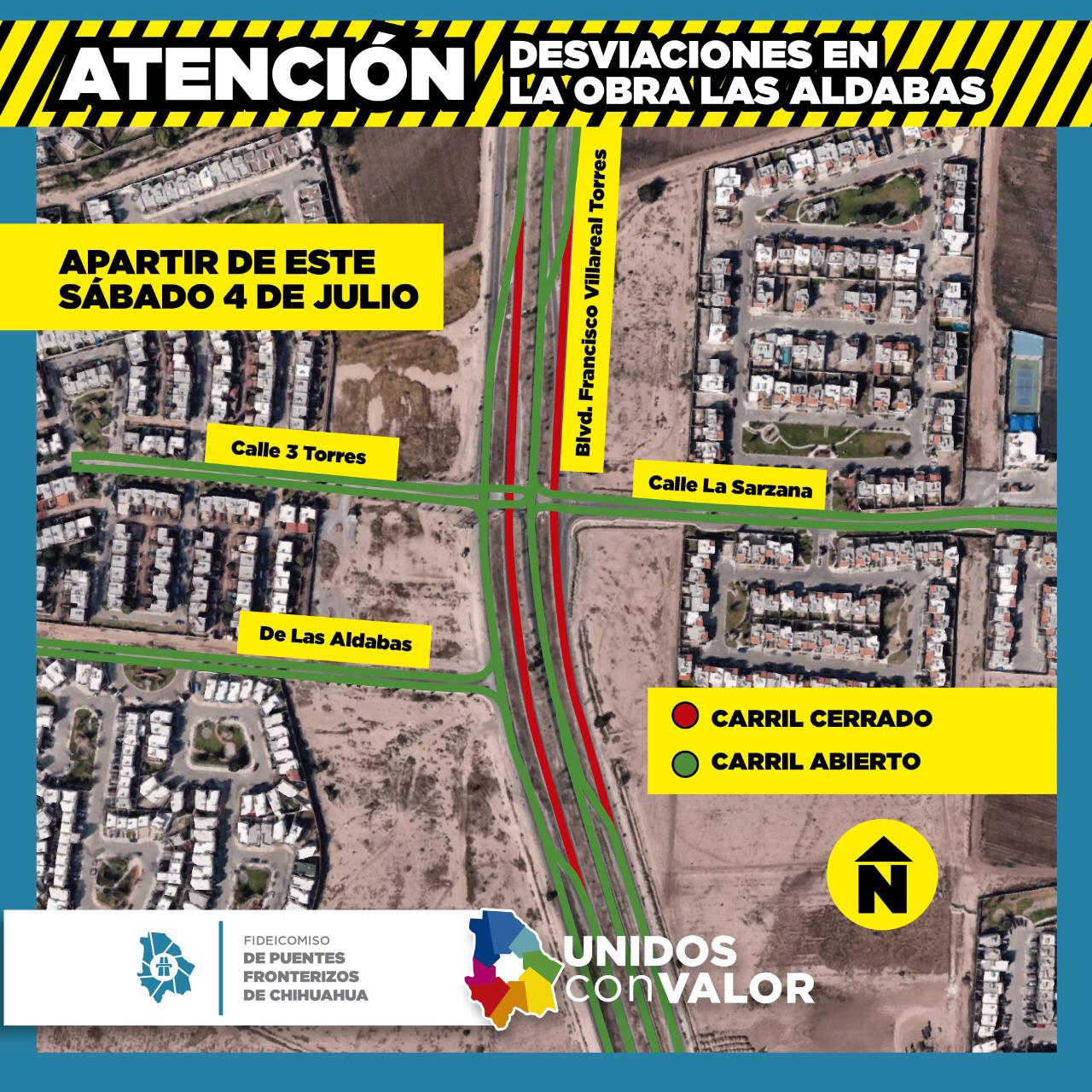 CD. JUAREZ, CHIH.- Anuncia Fideicomiso de Puentes Fronterizos de Chihuahua, modificaciones a la circulación vial en intersección de Francisco Villarreal Torres y La Sarzana, debido al inicio de obras del puente a desnivel “Las Aldabas”.