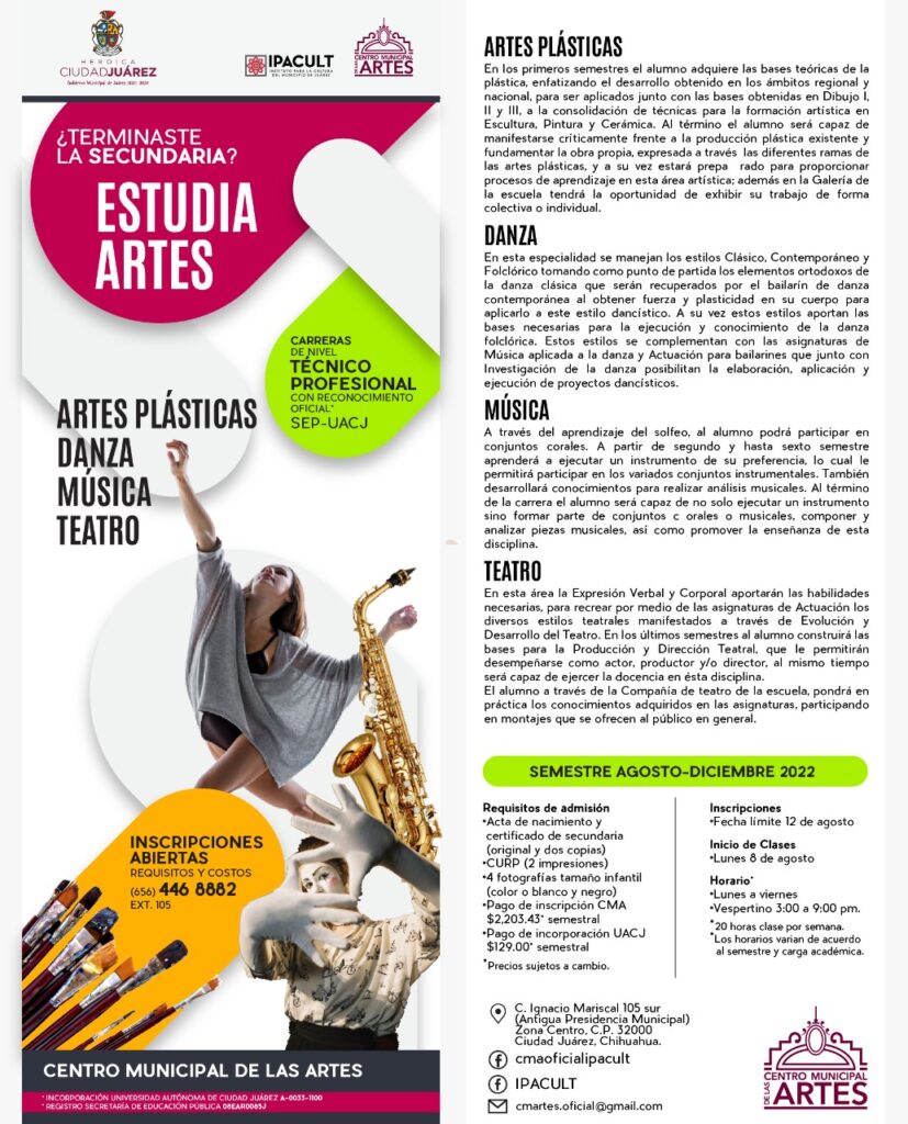 CD. JUAREZ, CHIH.- El Centro Municipal de las Artes (CMA) del Instituto para la Cultura del Municipio de Juárez (IPACULT), invita a la comunidad a cursar una carrera técnica profesional y formar parte de la siguiente generación de artistas en la ciudad.