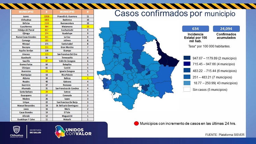 En el acumulado de casos por municipios, Ciudad Juárez lidera la estadística con 12 mil 926 personas confirmadas con contagio de COVID-19, seguida por la capital del estado con 5 mil 803, y Delicias con 1 mil 133.