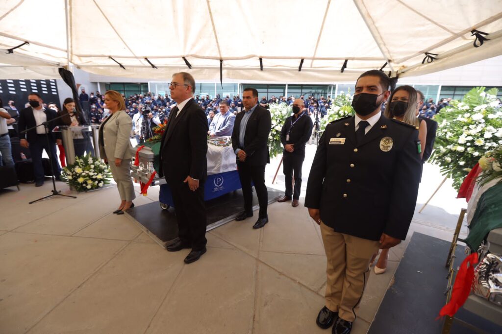 CD. JUAREZ, CHIH.- El Presidente Municipal, Cruz Pérez Cuéllar, acompañó a la Gobernadora María Eugenia Campos Galván, en el homenaje póstumo de los tres elementos de la Fiscalía General del Estado que fallecieron en el cumplimiento de su deber durante el pasado fin de semana.