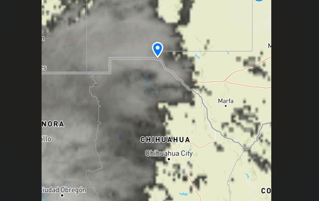 Actualmente se observa nubosidad en tránsito al oeste del municipio, con trayectoria hacia el noreste rumbo a territorio estadounidense. Hasta el momento, Ciudad Juárez solo recibe nubosidad de muy baja densidad, principalmente en la zona poniente.