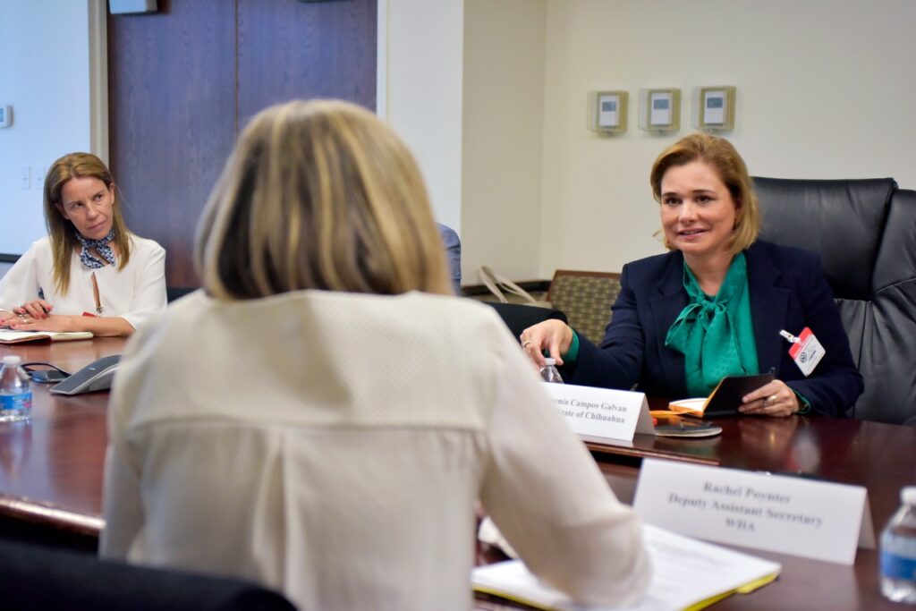 En compañía del Secretario de la Coordinación de Gabinete, la Gobernadora de Chihuahua fue recibida por el embajador de Estados Unidos en México y Rachel Poynter, subsecretaria adjunta para México y Canadá de la Oficina de Asuntos del Hemisferio Occidental para dar seguimiento a los programas que operan para la modernización y ampliación de las puertas de entrada de Chihuahua y Estados Unidos.