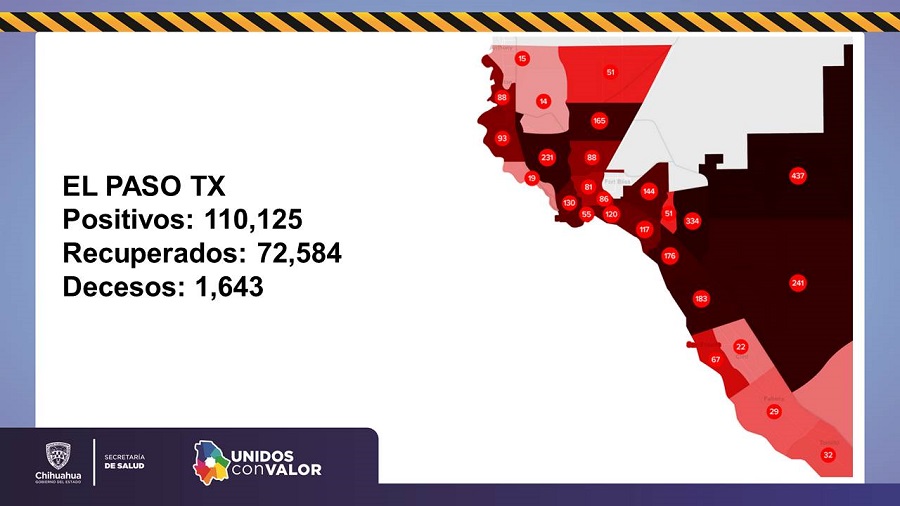 Las estadísticas en El Paso, Texas, al 24 de enero son las siguientes: 110 mil 125 confirmados (+519 nuevos, 18 casos con retraso); 1,643 decesos (+2) y 72 mil 647 recuperados (+341).