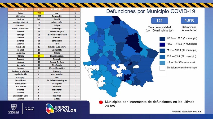 En la Conferencia Informativa #232 y Virtual #292, el subdirector médico de la dependencia en la Zona Norte, Arturo Valenzuela Zorrilla, dio a conocer que van 4 mil 610 defunciones, al sumarse tres nuevos fallecimientos, dos de ellos registrados en Juárez y uno en Ojinaga.