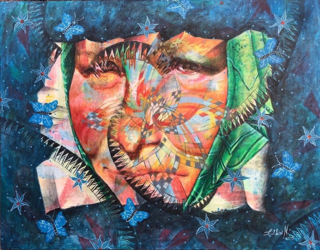 La pintura de Calderón está inscrita en el realismo fantástico, fusiona lo figurativo y lo simbólico. Sus obras evocan mitos, mariposas cósmicas y rostros fragmentados, creando mundos poéticos donde dialogan en un lenguaje visual profundamente evocador.