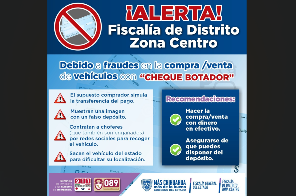 CD. JUAREZ, CHIH.- La Fiscalía de Distrito Zona Centro advirtió sobre el incremento de una modalidad de fraude en la compra/venta de vehículos, en donde se utiliza una figura denominada “cheque botador”.