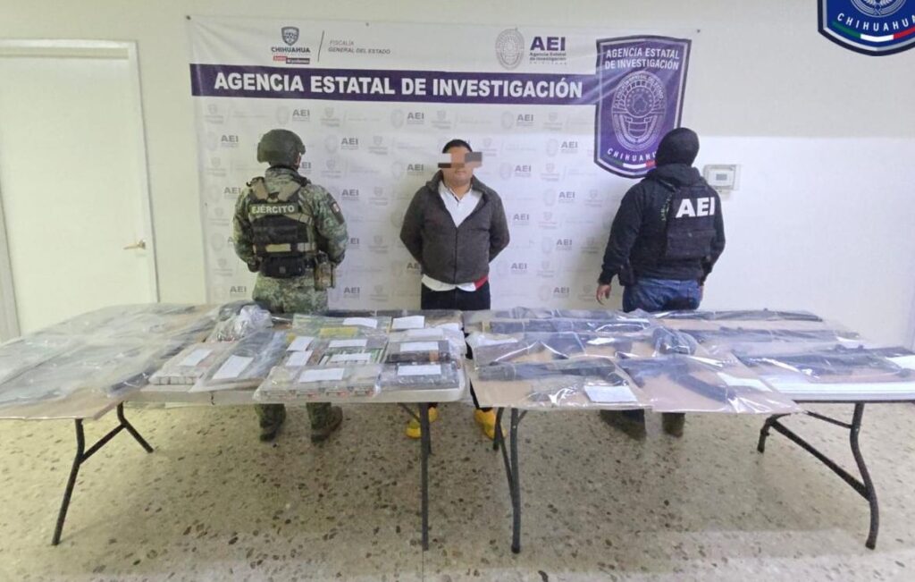 CHIHUAHUA, CHIH.-Como resultado de las investigaciones para el seguimiento y combate a las redes de tráfico de armas en la entidad, y a través de trabajo de inteligencia, Policías de la Agencia Estatal de Investigación de la Fiscalía General del Estado, con apoyo de personal del Ejército Mexicano, capturaron en la ciudad de Chihuahua a un sujeto en posesión de armas, cargadores y cartuchos, además de droga.