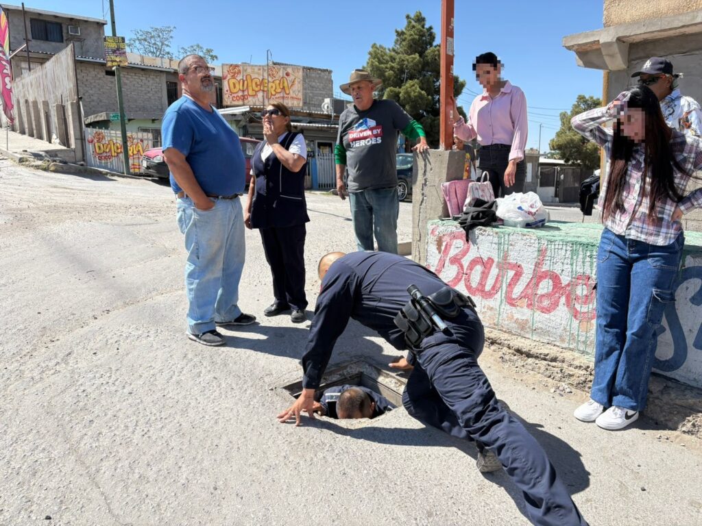 CD. JUAREZ, CHIH.-Agentes de la Secretaría de Seguridad Pública Municipal lograron rescatar a un can que se encontraba atrapado en el fondo de una alcantarilla que se ubica en calles de la colonia Galeana.