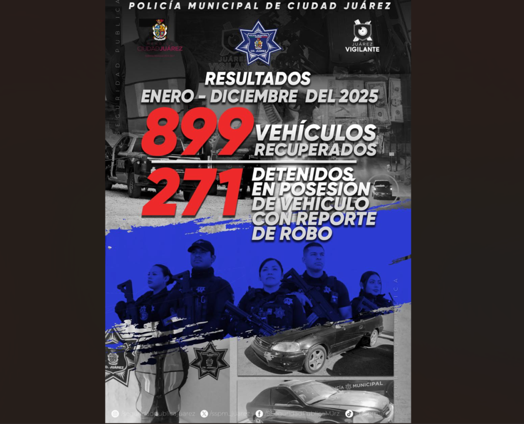 CD. JUAREZ, CHIH.- La Secretaría de Seguridad Pública Municipal informa a la ciudadanía los resultados obtenidos durante el cierre del año 2025, derivados de las acciones operativas, preventivas y de investigación implementadas para combatir el robo de vehículos y fortalecer la seguridad en el municipio.