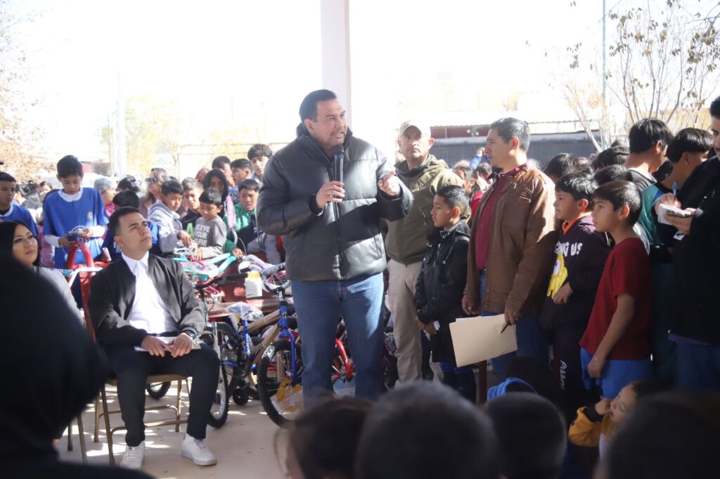 CD. JUAREZ, CHIH.- El Presidente Municipal, Cruz Pérez Cuéllar, participó en la posada de Espacios Públicos de los Centros Comunitarios, llevada a cabo en el parque Parajes del Sur, en un evento que congregó a numerosos niños, niñas y jóvenes que disfrutan de las instalaciones deportivas en este lugar.