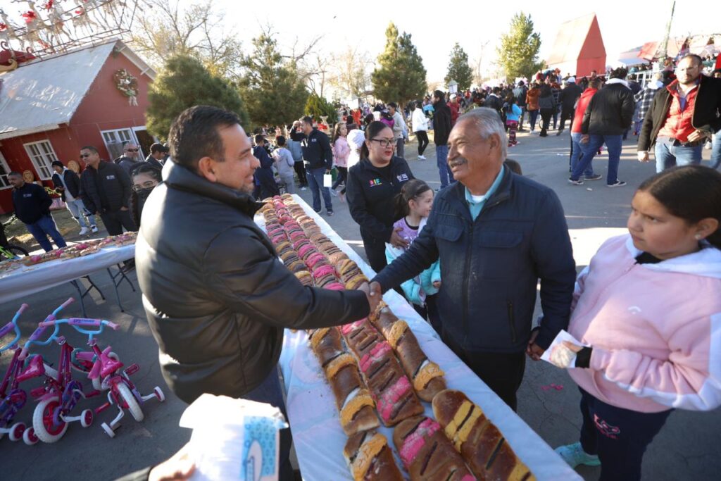 CD. JUAREZ, CHIH.- El Presidente Municipal, Cruz Pérez Cuéllar, acompañado de su esposa Rubí Enríquez, presidenta de Sistema para el Desarrollo Integral de la Familia (DIF) convivieron con distintas familias que se reunieron en el Parque DIF para celebrar el Día de Reyes.
