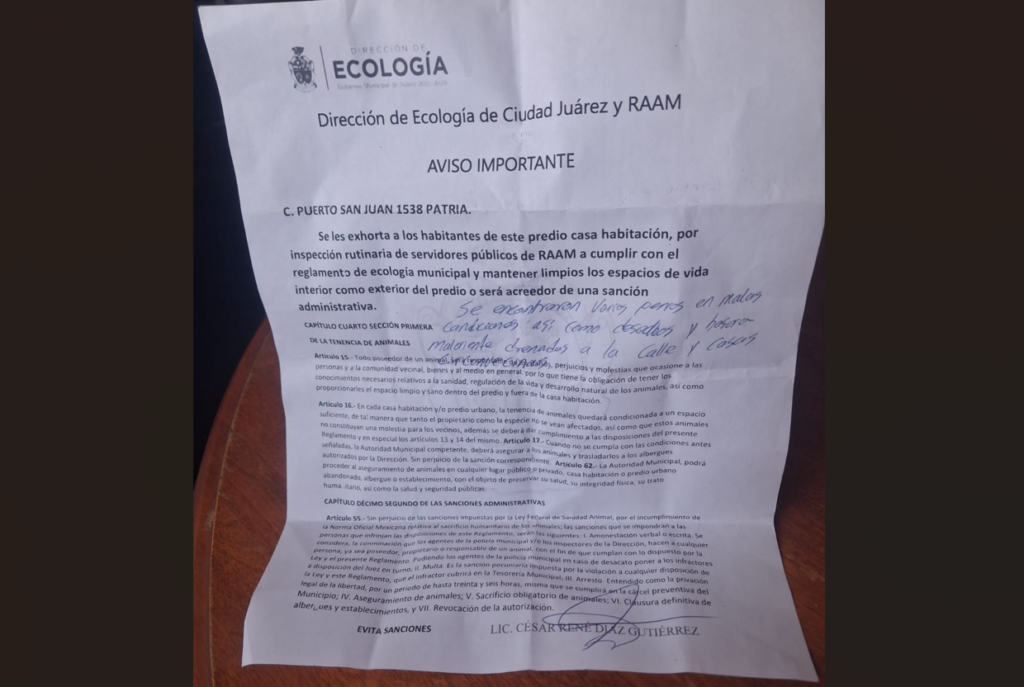 Ambos directores solicitaron a la ciudadanía no caer en este tipo de situaciones y si se llega a presentar alguna de estas situaciones, manden evidencia como fotos o video de la camioneta que anda dejando los citatorios al número de la Dirección de Ecología 656-199-0890 o al 656-554-3391 de DABA.