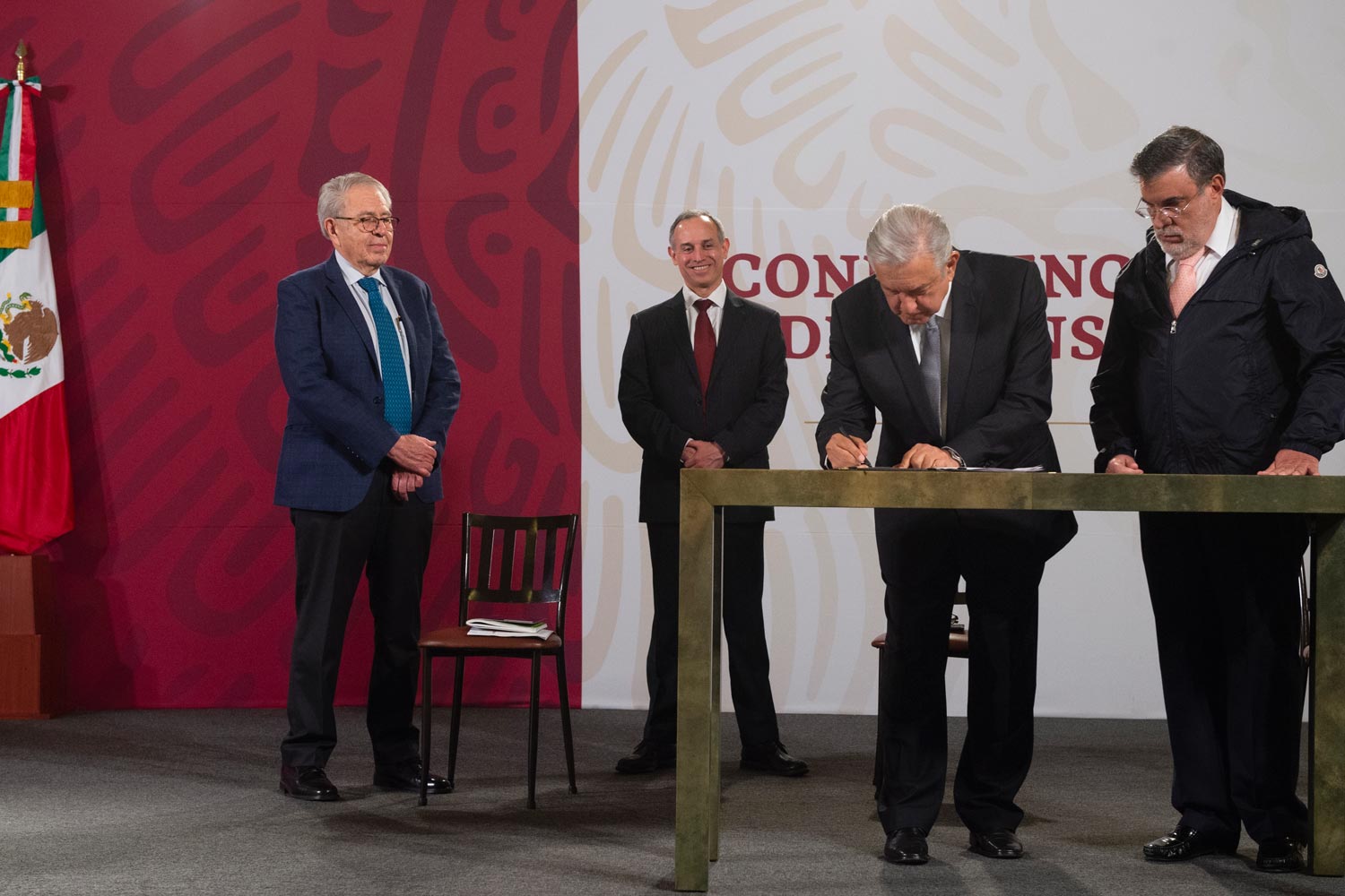Antes de enviarlo al Senado, el presidente firmó el documento en el Salón de la Tesorería, acompañado del secretario de Salud, Jorge Alcocer Varela y del subsecretario de Salud, Hugo López-Gatell Ramírez, quienes antecedieron este acto con la presentación del reporte semanal de avances del control de la epidemia de COVID-19.