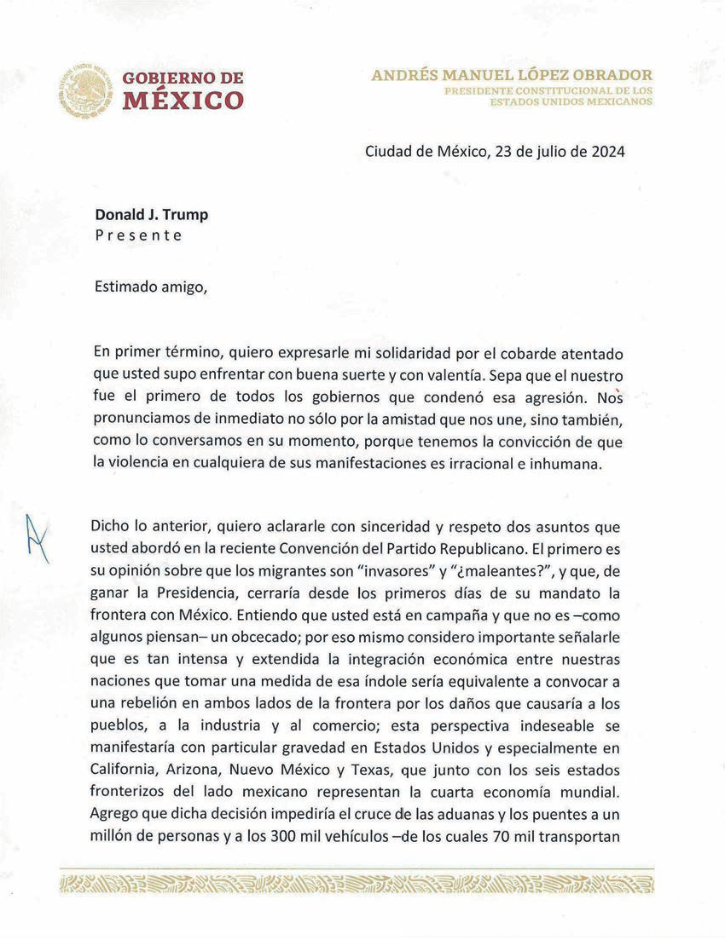CIUDAD DE MEXICO.- El presidente Andrés Manuel López Obrador presentó la carta que enviará a Donald Trump, expresidente y candidato presidencial republicano en Estados Unidos, en la que reafirma la defensa a la población mexicana migrante y su contribución al desarrollo de ese país; explica la importancia de la integración económica entre las naciones y plantea que es posible una apertura ordenada de la frontera.
