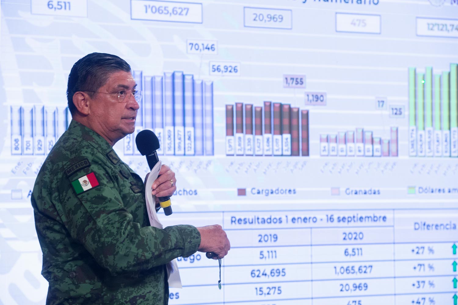 El secretario de la Defensa Nacional, Luis Cresencio Sandoval, dio cuenta de los aseguramientos de droga, armamento y numerario.