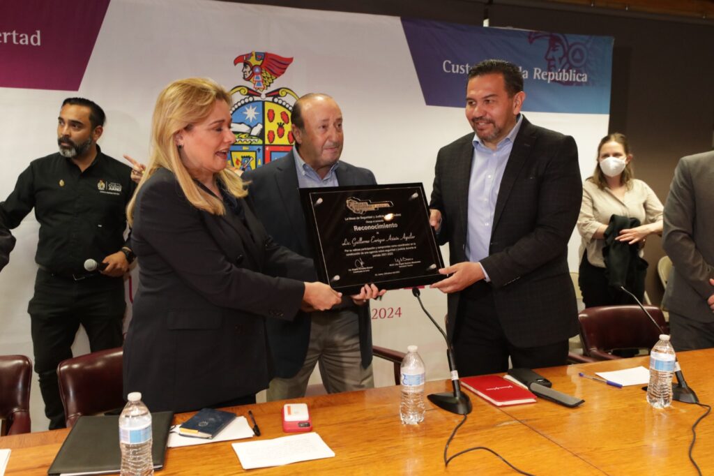Durante el desarrollo de la reunión, la Gobernadora y el Presidente Municipal encabezaron la entrega de un reconocimiento a Guillermo Asiain, por su labor como anterior titular de la Mesa de Seguridad y Justicia.
