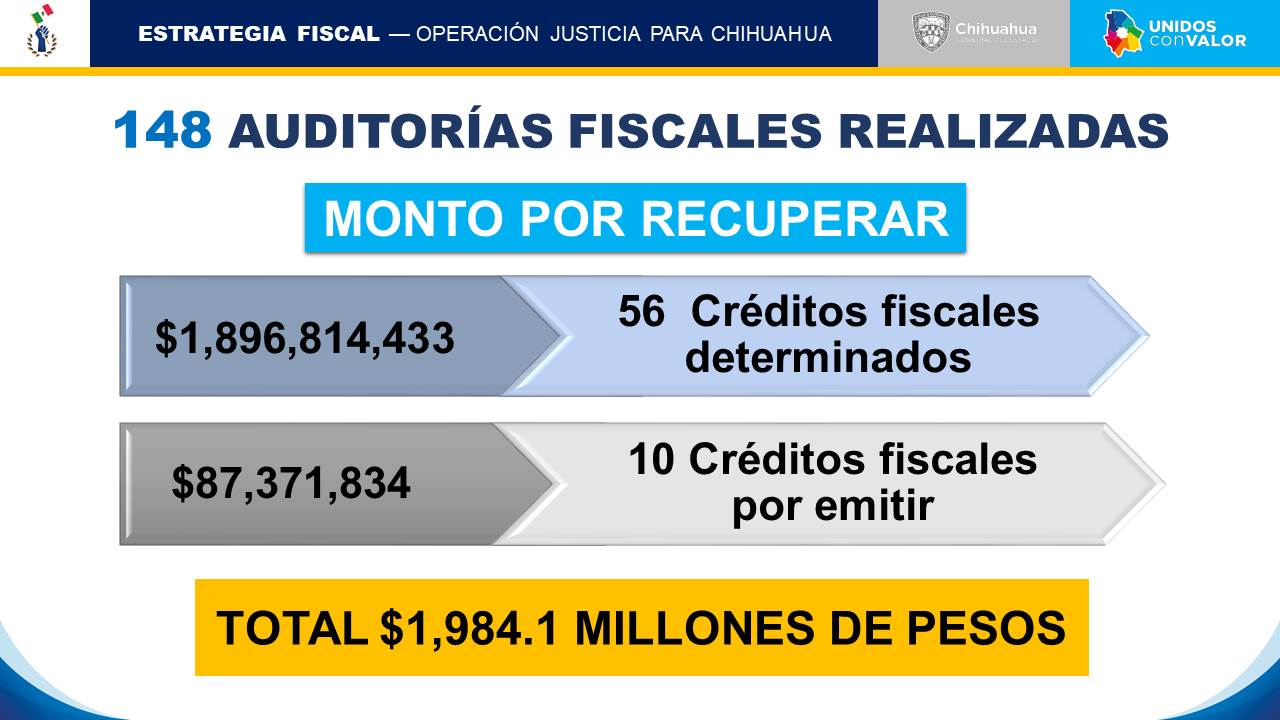 Además de los más de 577 millones ya recuperados, como parte de las acciones fiscales de la Operación Justicia para Chihuahua, se han practicado 148 auditorías, las cuales han derivado en la emisión de 56 créditos fiscales cuyo monto a recuperar es de mil 896 millones 814 mil 433 pesos.