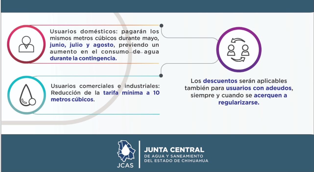 La dependencia informó que de manera temporal y en solidaridad con las familias chihuahuenses, se realizaron modificaciones en los lineamientos especiales y bonificaciones de las cuotas publicadas el pasado 28 de marzo, que se harán efectivas a través de las juntas municipales (JMAS) y rurales (JRAS) de cada localidad.