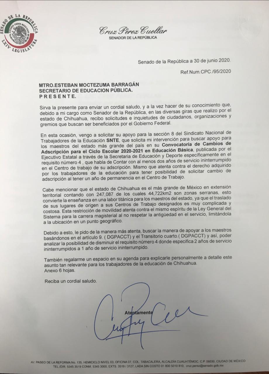 Atendiendo a dicha solicitud, el senador morenista, solicitó al secretario de educación pública Esteban Moctezuma Barragán, analizar la posibilidad de disminuir el requisito que especifica dos años de servicio ininterrumpidos a un año de servicio ininterrumpido, además de solicitar un espacio en la agenda para explicar personalmente a detalle este asunto tan relevante para los trabajadores de la educación en Chihuahua.