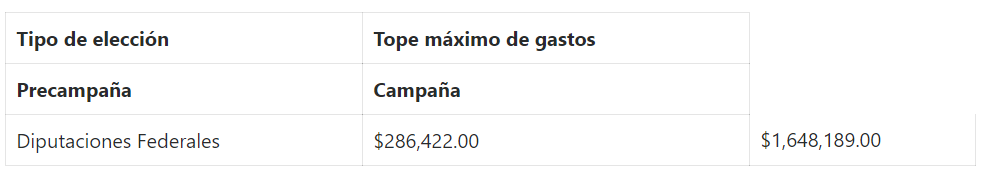 De acuerdo con la Ley General de Instituciones y Procedimientos Electorales (LGIPE), dijo, el tope de gastos de precampaña por precandidata o precandidato será equivalente al 20% del que se estableció para las campañas inmediatas anteriores a Diputaciones Federales.