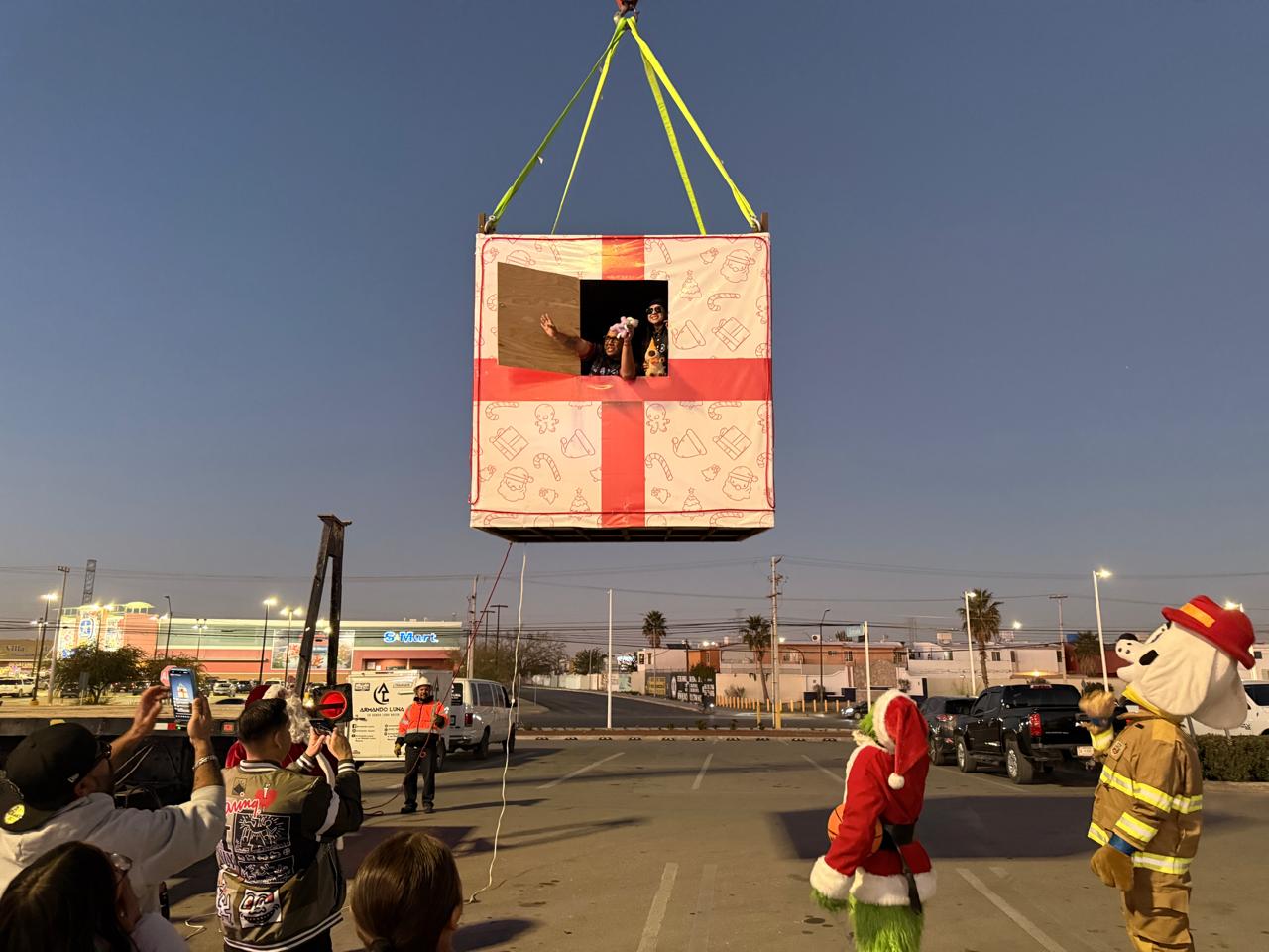 CD. JUAREZ, CHIH.- La campaña solidaria “Un Regalo de Altura III” inició este jueves en el exterior de Plaza Sendero, donde los locutores juarenses Román Vázquez y Shaon Ortiz ascendieron a más de 40 metros de altura dentro de una estructura metálica de 2×2 metros decorada como un regalo gigante.