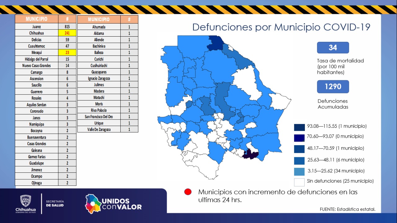 De esta manera, 815 decesos han ocurrido en pacientes con residencia en Ciudad Juárez, 241 en la ciudad de Chihuahua, 47 en Cuauhtémoc, 2 en Guadalupe D. B., 6 en Ascensión, 8 en Camargo, 4 Rosales, 1 Bachíniva, 23 Meoqui, 2 Buenaventura, 59 Delicias, 1 Ignacio Zaragoza, 1 San Francisco del Oro, 15 Parral, 1 Madera, 3 Coronado, 14 Nuevo Casas Grandes, 2 Ojinaga, 1 Valle de Zaragoza, 2 Bocoyna, 6 Saucillo, 1 Morís, 2 Gómez Farías, 2 Jiménez, 1 Urique, 2 Casas Grandes, 1 Allende, 3 Janos, 2 Galeana, 2 Ocampo, 3 Aquiles Serdán, 1 Balleza, 1 Matachí, 5 Guerrero, 3 Namiquipa, 1 Riva Palacio, 1 Julimes, 1 Guazapares, 1 Carichí, 1 Ahumada, 1 Cusihuiriachi y 1 Aldama.