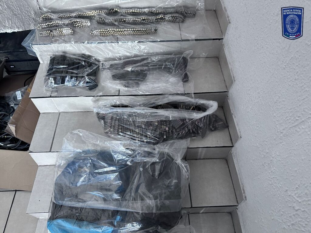 Así mismo, se localizaron dos mochilas, una de color negro y otra azul, las cuales contenían 10 cargadores para arma larga y 1,854 cartuchos útiles de diferentes calibres; también se encontró un arma larga de color negro, con cachas de madera, marca Norinco, calibre 7.62 x 39mm, conocida como “cuerno de chivo”, sin matrícula visible.