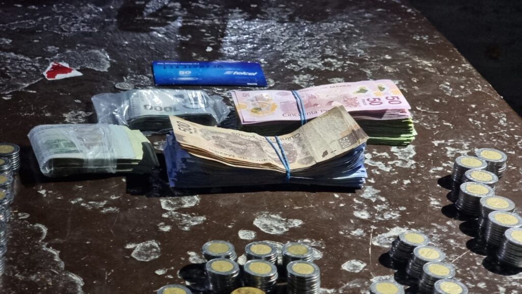 Además, las fuerzas policiales encontraron dinero en efectivo sumando un total de 105 mil pesos en papel billete nacional, mil 720 pesos en moneda nacional y mil 700 dólares.