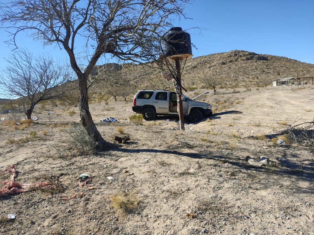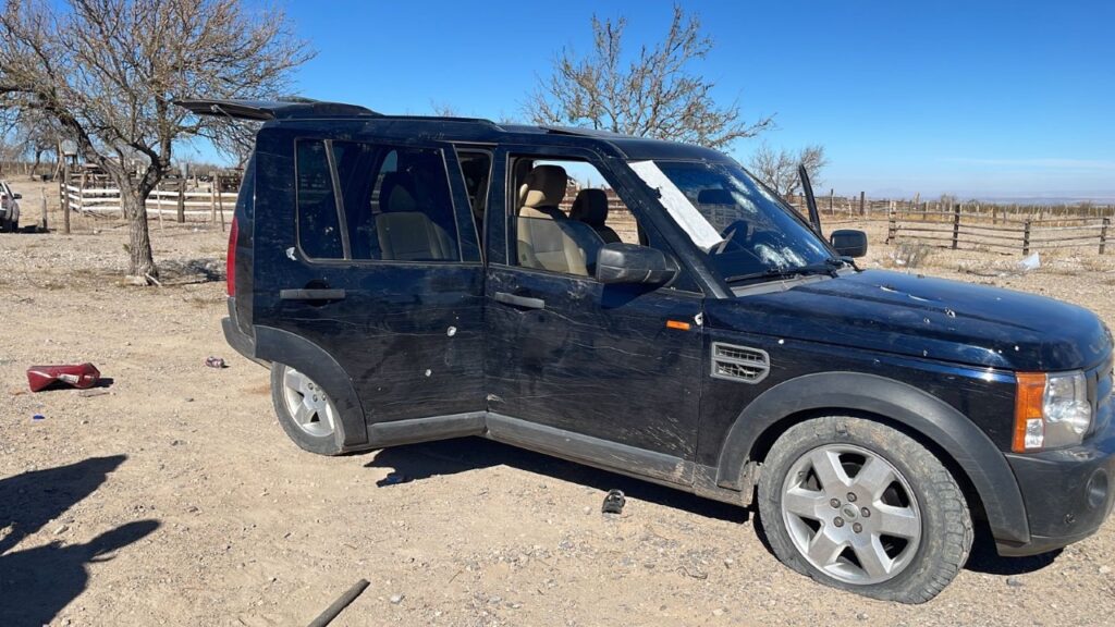 Aproximadamente a 18 kilómetros del poblado Barreales, por la brecha mencionada, se tuvo a la vista un predio cercado y en el lugar se localizó una camioneta Land Rover de color negro, blindada; una Chevrolet Tahoe, de color arena; dos pick up Ford Ranger, de color blanco y una Chevrolet Silverado, todos los vehículos con impactos de proyectil de arma de fuego.