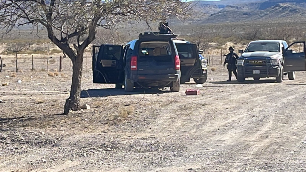 Aproximadamente a 18 kilómetros del poblado Barreales, por la brecha mencionada, se tuvo a la vista un predio cercado y en el lugar se localizó una camioneta Land Rover de color negro, blindada; una Chevrolet Tahoe, de color arena; dos pick up Ford Ranger, de color blanco y una Chevrolet Silverado, todos los vehículos con impactos de proyectil de arma de fuego.
