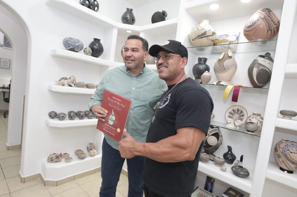 CASAS GRANDES, CHIH.- En el marco del Concurso de Cerámica de Juan Mata Ortiz, el Presidente Municipal, Cruz Pérez Cuéllar, asistió como invitado a la presentación del libro bilingüe Poetry of the Clay, Poesía del barro, escrito por Charmayne Samuelson.
