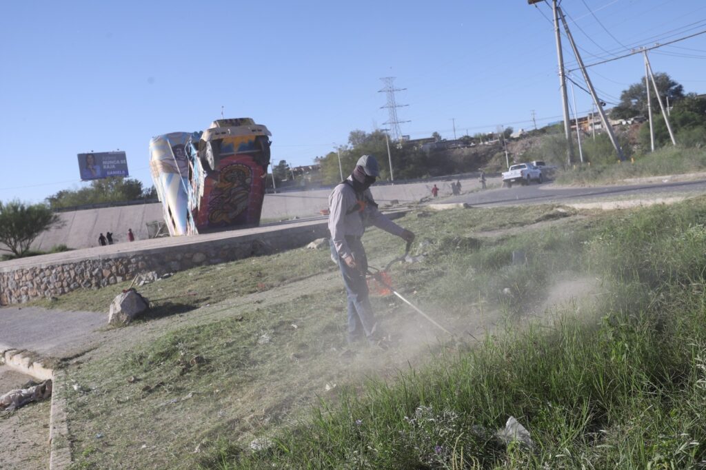 CD. JUAREZ, CHIH.- Como parte de las acciones permanentes de mantenimiento a los espacios públicos, personal de la Dirección de Parques y Jardines realizó trabajos de limpieza en las áreas verdes que rodean el monumento “Ser Fronterizo”, ubicado sobre el bulevar Francisco Villarreal Torres y avenida Paseo de la Victoria.