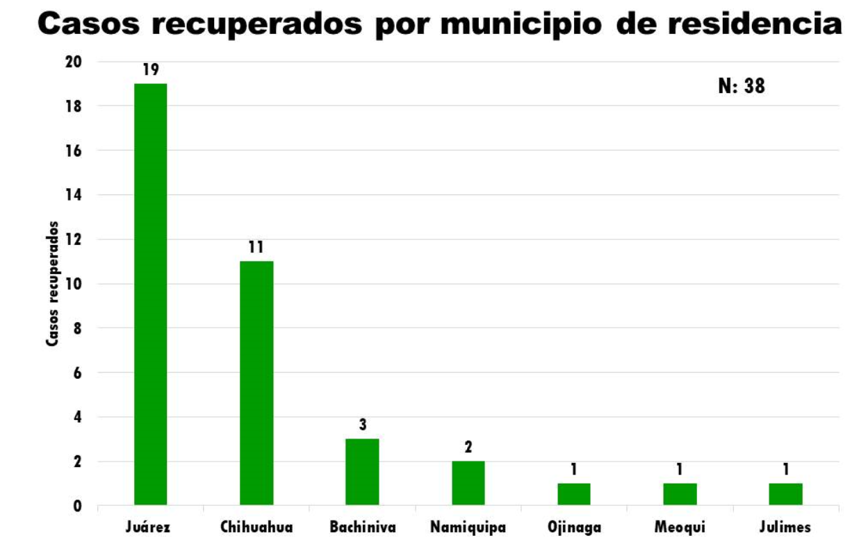 De los 38 casos recuperados, 19 corresponden a Ciudad Juárez, 11 a Chihuahua, 3 a Bachíniva, 2 a Namiquipa, 1 a Julimes, 1 a Ojinaga y 1 a Meoqui. Además, 6 son del rango de edad de 15 a 19 años; 2 de 20 a 24; 19 de 25 a 44 ; 9 de 45 a 64 y 2 de 70 a 74.
