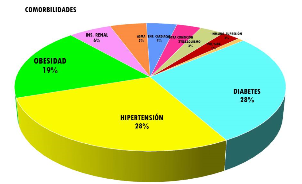 Los porcentajes presentados de comorbilidad son: 28% diabetes, 28% hipertensión, 19% obesidad, 5% asma, 4% enfermedad cardiaca, 6% insuficiencia renal, 3% tabaquismo, 3% inmunosupresión, 1% VIH/SIDA y 3% de otro tipo.