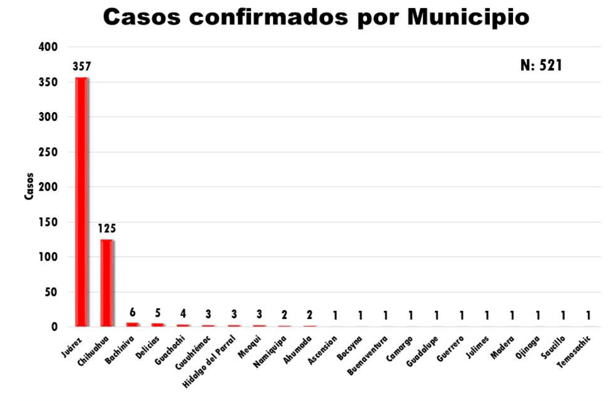 Así, de los confirmados por pruebas PCR: 357 pertenecen a Ciudad Juárez, 125 a la ciudad de Chihuahua, seis a Bachíniva, tres a Cuauhtémoc, uno a Ojinaga, dos a Namiquipa, tres a Meoqui, uno a Julimes, uno a Camargo, uno a Saucillo, dos de Ahumada, uno a Guadalupe, cuatro a Guachochi, cinco a Delicias, uno de Ascensión, uno a Guerrero, una a Bocoyna, uno a Madera, tres a Hidalgo del Parral, uno a Buenaventura y uno en Temosachi.
