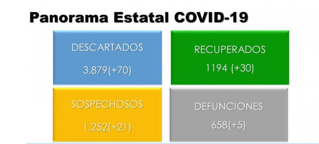 A la fecha, el total de recuperados es de 1,194 (+30), suman 3,879 los descartados (+70) y hay 1,252 casos sospechosos (+21).