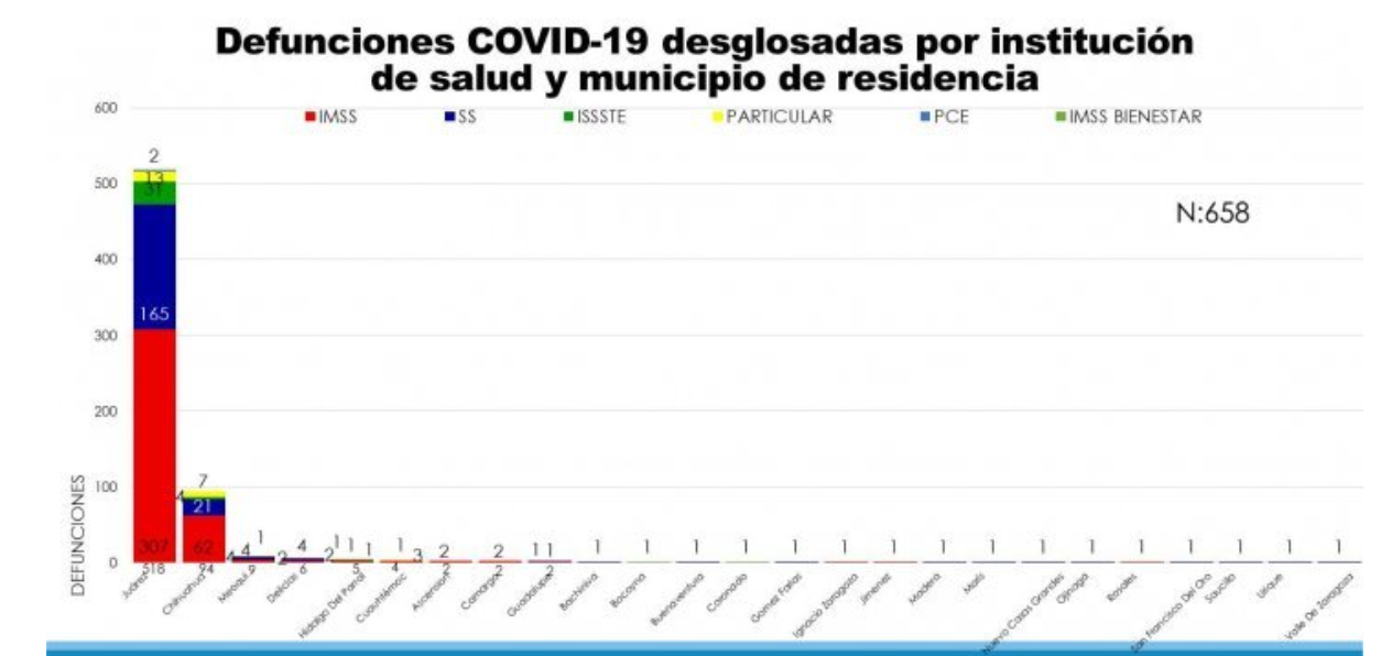 Defunciones por municipio e institución médica. Juárez: 307 IMSS, 165 SS, 31 Issste, 13 particular, 2 PCE. Chihuahua: 62 IMSS, 21 SS, 4 Issste, 7 particular. Cuauhtémoc: 3 IMSS, 1 Particular. Guadalupe: 1 IMSS, 1 SS. Ascensión: 2 IMSS. Camargo: 2 IMSS. Rosales: 1 IMSS. Bachíniva: 1 SS. Meoqui: 4 IMSS, 4 SS, 1 particular. Buenaventura: 1 SS. Delicias: 2 IMSS, 4 SS. Ignacio Zaragoza: 1 IMSS. San Francisco del Oro: 1 SS. Parral: 2 IMSS, 1 Issste, 1 IMSS Bienestar, 1 SS. Madera: 1 SS. Coronado: 1 IMSS Bienestar. NCG: 1 SS. Ojinaga: 1 SS. Valle de Zaragoza: 1 SS. Bocoyna: 1 IMSS Bienestar. Saucillo: 1 SS. Moris: 1 SS. Gómez Farías: 1 SS. Jiménez: 1 IMSS y Urique: 1 SS.