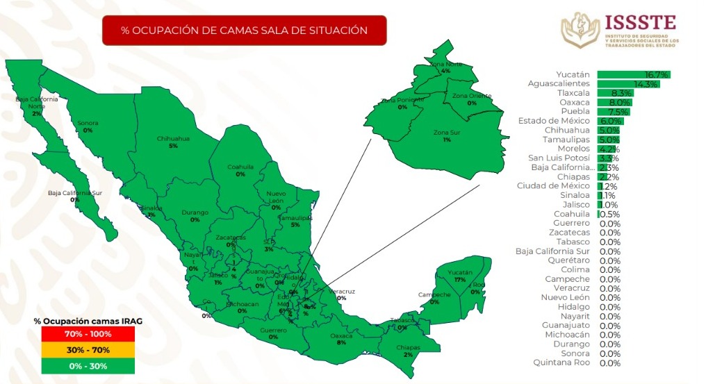 Las entidades con ocupación hospitalaria son: Yucatán, 16.7 por ciento; Aguascalientes, 14.3 por ciento; Tlaxcala, 8.3 por ciento; Oaxaca, 8 por ciento; Puebla, 7.5 por ciento; Estado de México, seis por ciento; Chihuahua, cinco por ciento; Tamaulipas, cinco por ciento; Morelos,4.2 por ciento; San Luis Potosí, 3.3 por ciento; Baja California, 2.3 por ciento; Chiapas, 2.2 por ciento; Ciudad de México, 1.2 por ciento; Sinaloa, 1.1 por ciento; Jalisco, uno por ciento y Coahuila, 0.5 por ciento. El resto de las entidades, sin pacientes internados.