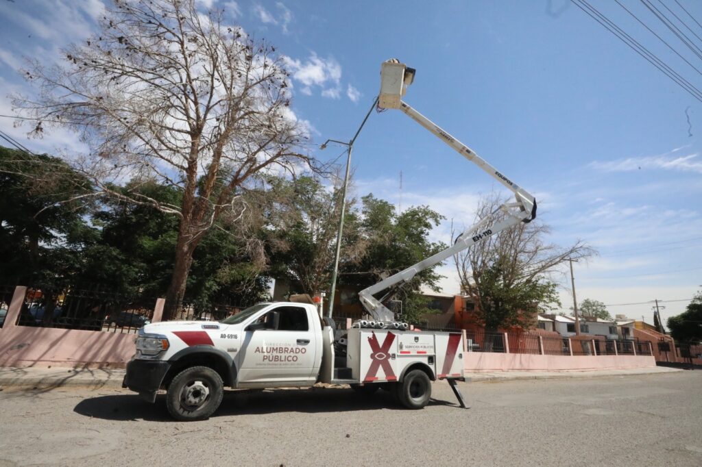 CD. JUAREZ, CHIH.- Como parte del compromiso del Presidente Municipal, Cruz Pérez Cuéllar, para modernizar el sistema de iluminación, la Dirección de Alumbrado Público intervino este lunes en el fraccionamiento Villas de San Ángel, donde se instalaron nuevas lámparas con tecnología LED.