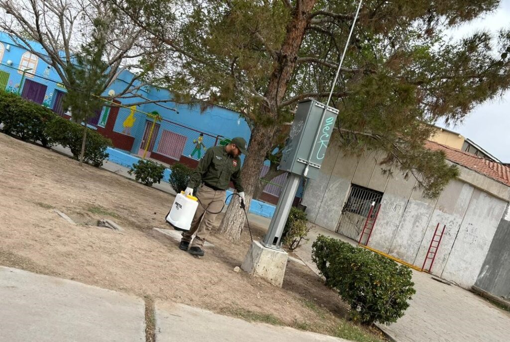 CD. JUAREZ, CHIH.- Este día la brigada de fumigación de la Dirección de Ecología llevó a cabo la desinfección en el parque Borunda, uno de los lugares más frecuentados por los habitantes de Ciudad Juárez, quienes disfrutan de paseos en familia y con sus mascotas.