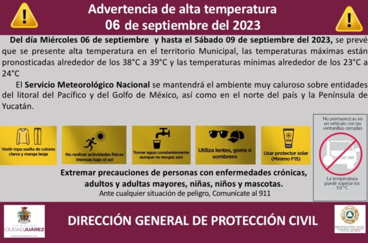 POR REDACCIÓN. Miércoles 06 de septiembre de 2023. CD. JUAREZ, CHIH.- La Dirección General de Protección Civil, con base en...