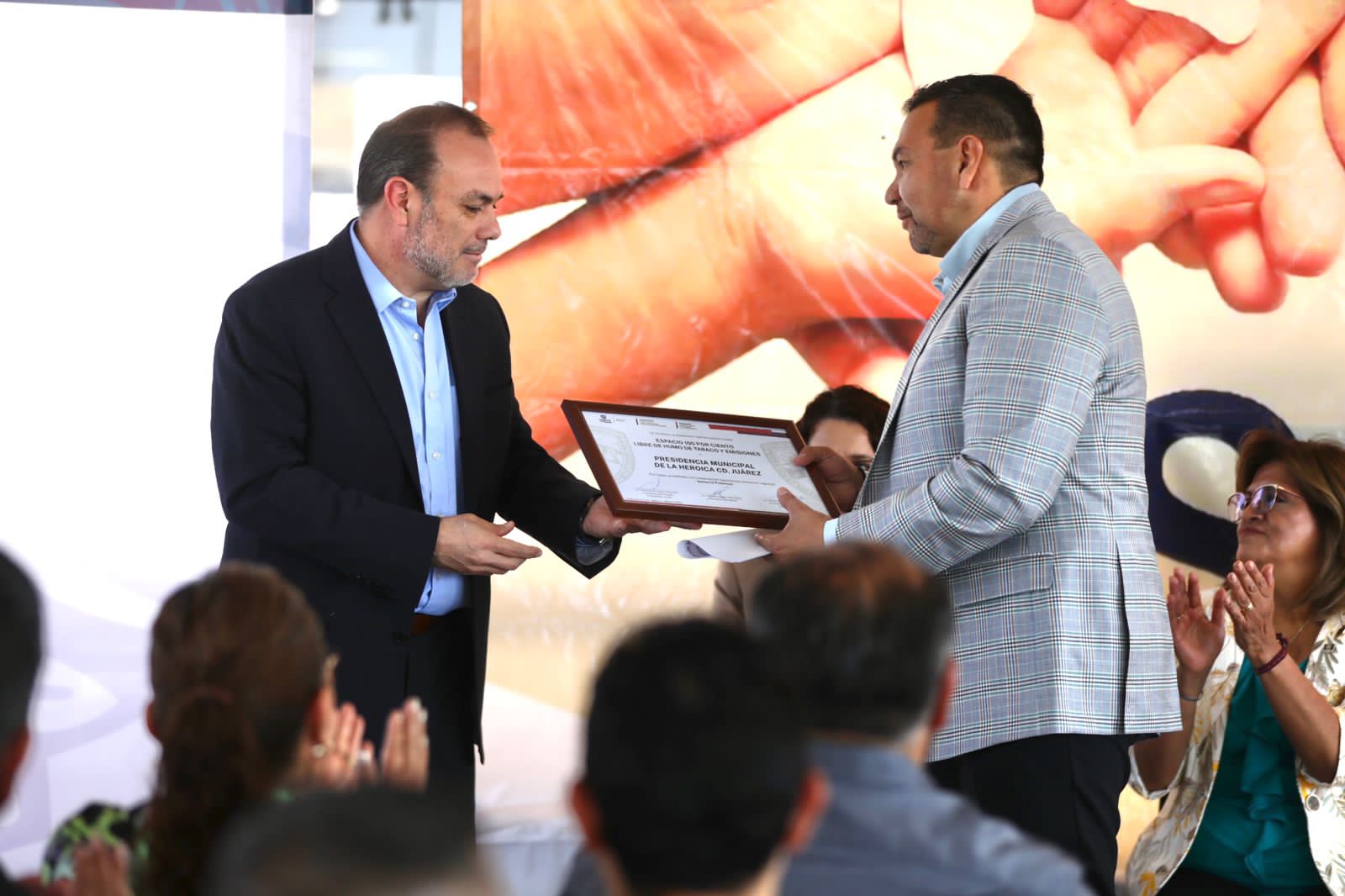 Durante el evento se llevó a cabo la entrega de reconocimientos a diversas instancias que han colaborado con los trabajos para certificar los espacios libres de humo y promover hábitos saludables entre la ciudadanía, por ello se entregaron placas alusivas para los representantes del Centro de Salud Anapra, Centro Ambulatorio para la Prevención y Atención del SIDA, Vivir para Amar y Servir, Centro Comunitario UACJ, Jardín de Niños Eva Sámano de López Msteos, Centro de Bachillerato Tecnológico Industrial y de Servicios 114 (CBTIS) y la Dirección de Salud.
