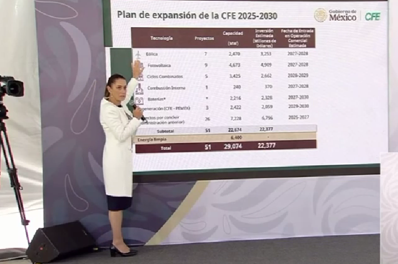 CIUDAD DE MEXICO.- La Presidenta Claudia Sheinbaum Pardo, anunció 51 proyectos de electricidad como parte del Plan de Fortalecimiento y Expansión del Sistema Eléctrico Nacional 2025-2030 de la Comisión Federal de Electricidad (CFE), el cual tendrá una inversión estimada de más de 22 mil 377 millones de dólares (mdd), con el objetivo de generar 22 mil 674 megawatts (MV).
