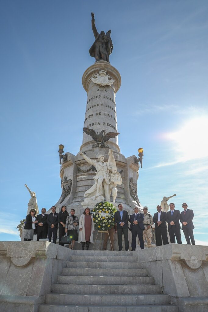 CD. JUAREZ, CHIH.- El Gobierno Municipal conmemoró hoy el 217 aniversario del natalicio del Benemérito de las Américas; en el marco de la ceremonia protocolaria se colocó una ofrenda floral al pie del Monumento a Benito Juárez.