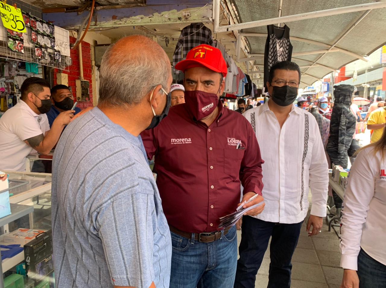CD. JUAREZ, CHIH.- Juan Carlos Loera, candidato a la gubernatura por la Coalición Juntos Haremos Historia en Chihuahua (Morena, PT y Nueva Alianza), visitó las calles del centro de Ciudad Juárez, y estuvo en los mercados Cuauhtémoc y Reforma.