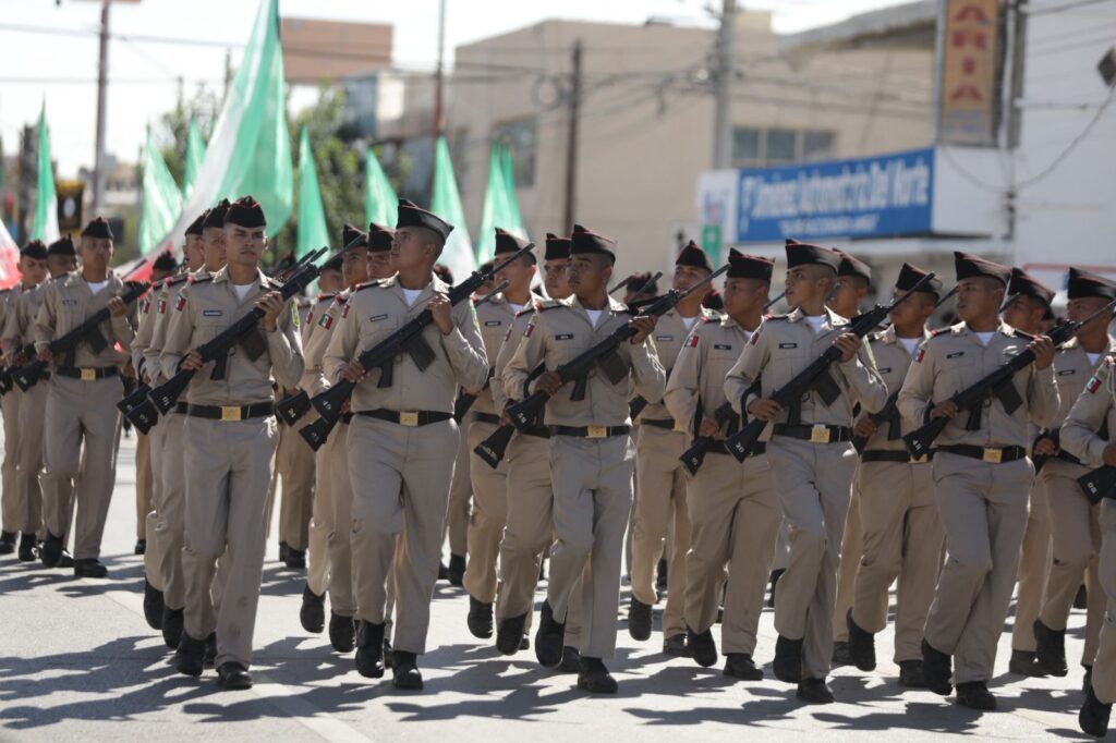 Con paso firme avanzaron las escoltas de bandera de los cuerpos militares y policiales, así como de escuelas representativas de la ciudad, entre ellas la Universidad Autónoma de Ciudad Juárez y el Instituto Tecnológico de Ciudad Juárez.