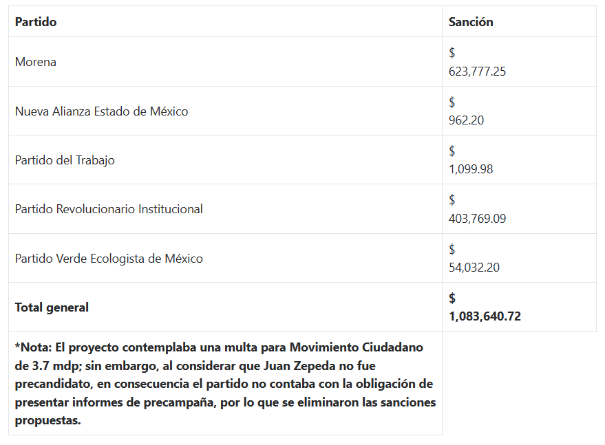 En el caso del Estado de México, el resumen de las sanciones impuestas a los partidos políticos por irregularidades en la etapa de precampaña es el siguiente: