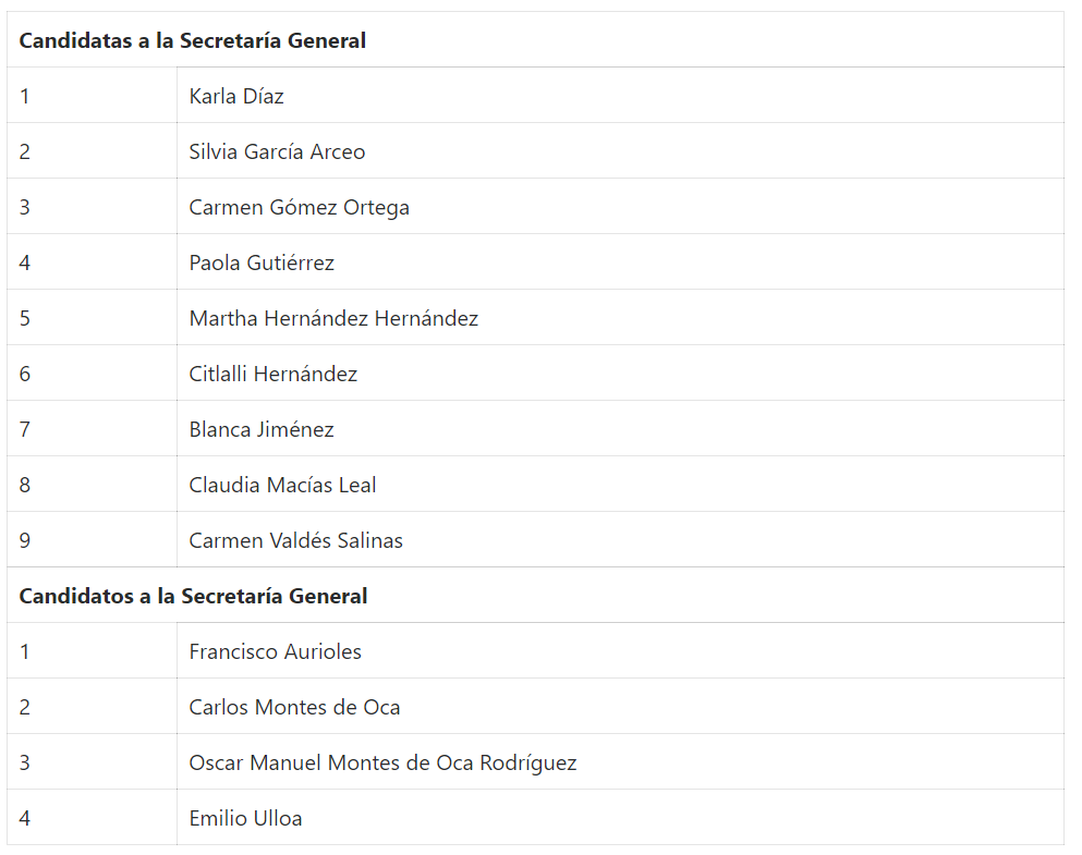 Para la Secretaría General se preguntará de manera separada por 9 candidatas y 4 candidatos dado que el género de quien ocupe este cargo se definirá de acuerdo con la persona elegida en la Presidencia.