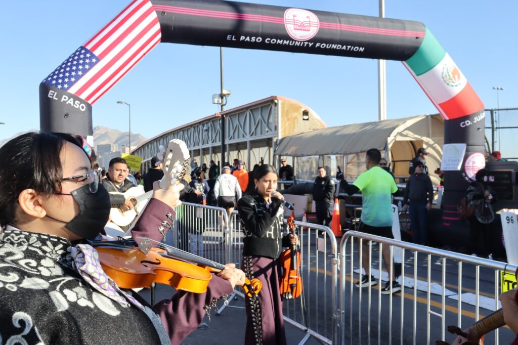 Una vez en la línea sobre el puente internacional Paso del Norte, ahí los corredores cruzaron la meta al son de la música de mariachi que los esperaba al igual que amigos y familiares felices.